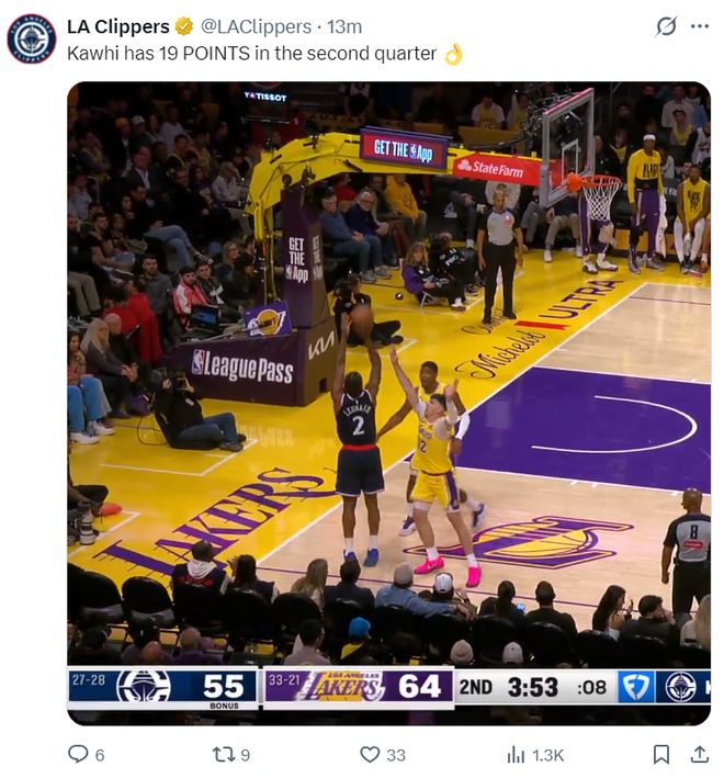 小卡进入Zone后湖人的单防完全防不了,雷迪克想要夹击他可他在夹击形成前就已经出手拿分了,还是连续完成两个2+1,卡哇伊再度连拿5分帮助快船缩小到6分,泰伦卢终于换下小卡休息。伦纳德单节11中6+三分3中2+罚球5中5拿到19分3篮板1助攻。