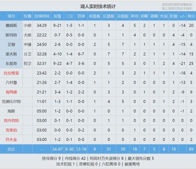 湖人上半场三分球15中7,三分命中率高达46.7%。不过湖人两分球只有28中11,两分命中率39.3%,凯尔特人两分球命中率51.4%。东契奇上半场14中6拿到18分2助攻,里夫斯7中2得到9分2篮板,詹姆斯8中3拿到6分4助攻。