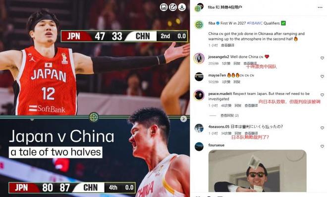 对于本场比赛的离谱吹罚,就连外国球迷也是看不下去了,在FIBA官方评论区纷纷留言:“裁判还没放弃”、“今天的裁判太不要脸了”、“日本买通了日本还是输了”、“裁判35秒吹中国13个犯规”。
