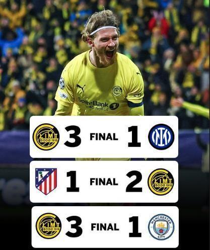这是挪威俱乐部在欧冠历史第2次击败意甲球队,上一次还要追溯到1996年罗森博格击败AC米兰。凭借这场胜利,博德闪耀解锁了一项极为了不起的成就,成为欧冠历史上第4支达成三连胜的非五大联赛球队。此前做到这一点的三支球队,帕纳辛纳科斯、本菲卡、圣彼得堡泽尼特,无一不是各自时代的枭雄。更恐怖的是,闪耀哥的三连胜含金量极高:客场2-1胜马竞、主场3-1胜曼城、主场3-1胜国米,刀下不斩无名之辈。