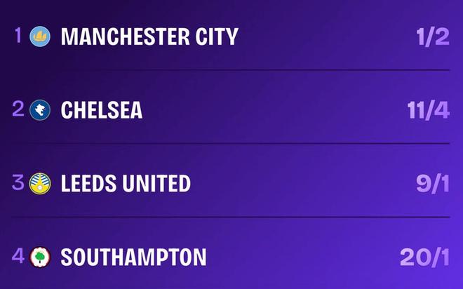 足总杯四强夺冠赔率:曼城第1,切尔西第2,南安普顿第4