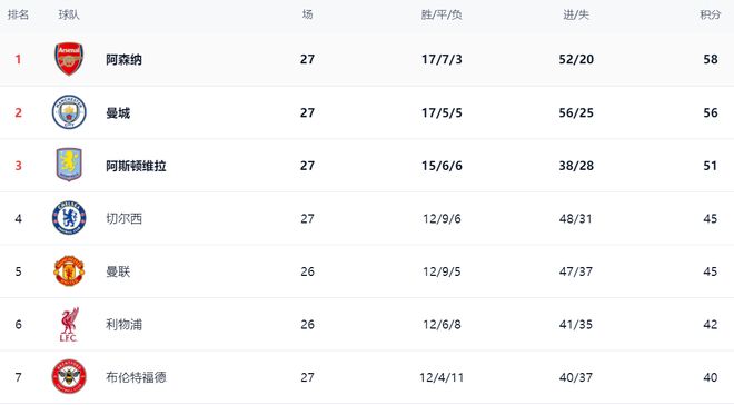 在积分榜上,阿森纳依然占据榜首位置,战绩是17胜7平5负,拿到58分。曼城赢球之后继续缩小与阿森纳的差距。曼城总积分达到56分,仅仅落后阿森纳2分。曼城最快下一轮能够登顶,当然,大前提是阿森纳丢分。没想到阿森纳之前累积的优势变得这么小。阿斯顿维拉51分排名第3。战平的切尔西总积分是45分,排名第4。少赛一场的曼联也是45分,排名第5。利物浦以42分排名第6。