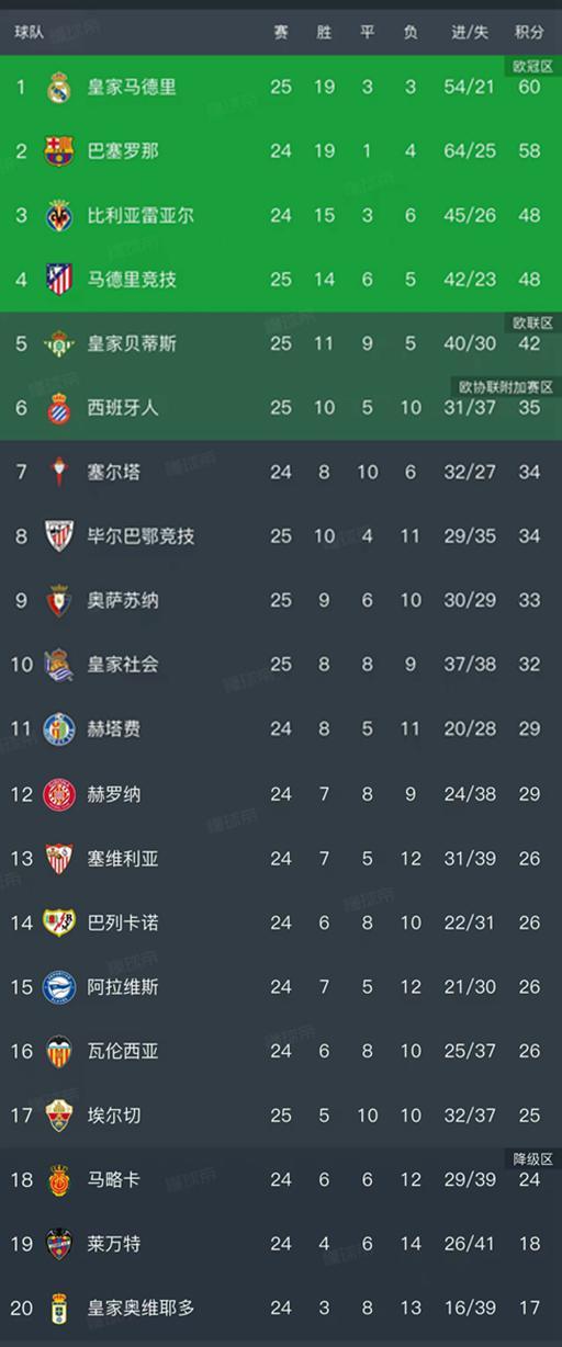 北京时间2月22日,西甲第25轮率先结束了5场比赛,我们看看最新积分榜变动,主要的信息是:皇马1-2爆冷不敌奥萨苏纳、马竞4-2大胜西班牙人、毕尔巴鄂竞技2-1埃尔切、皇家社会3-3皇家奥维耶多,皇家贝蒂斯1-1巴列卡诺。
