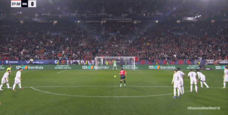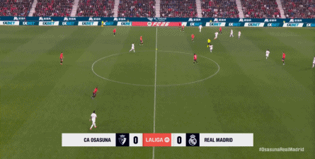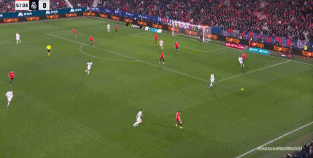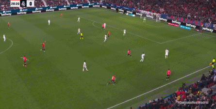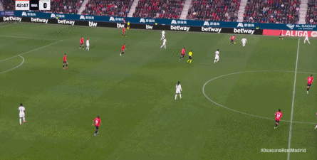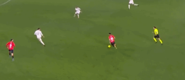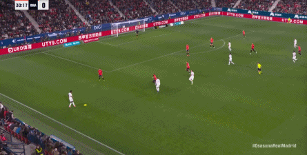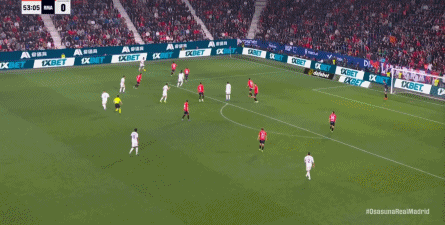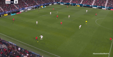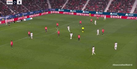 其中一次就是上半场的开分球,在皇马的进攻和逼抢都极其低效的情况下,奥萨苏纳很容易地就能获得起脚空间,就像这次,在边路的处理压力都不大,于是一脚斜长传打到结合部,让皇马付出了点球的代价: