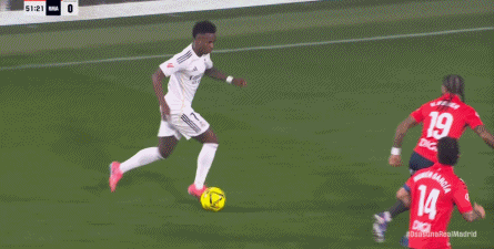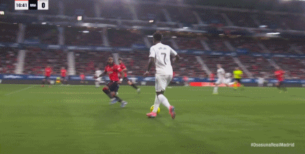首先在进攻端,维尼修斯从边路启动进攻,起脚质量不佳,直接被奥萨苏纳门将没收,维尼修斯必须要从边路开打,包括姆巴佩带着防守球员到他身边接球的思路,都是皇马的老毛病了,一点都不稀奇: