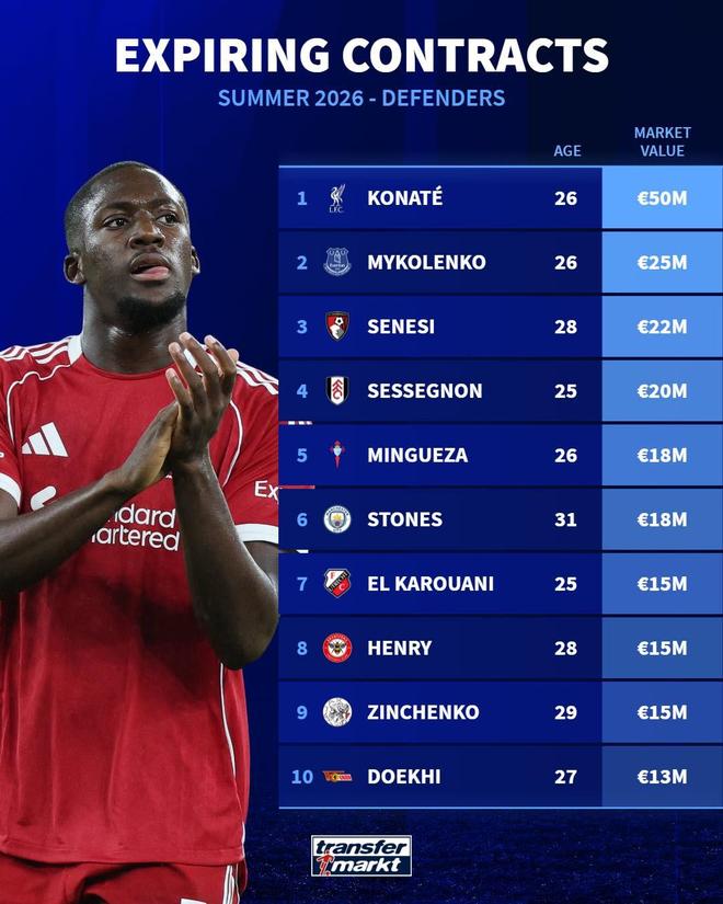 德国转会市场统计了今夏合同到期的十大后卫,其中球员按照身价从高到低排序。
