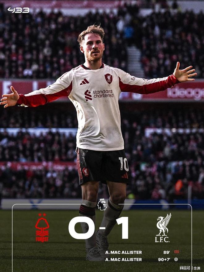 客场1-0诺丁汉森林,各项赛事3连胜。阿利松救险,利物浦半场0射正,下半场琼斯近距离攻门被奥尔特加挡出,麦卡利斯特“被动”绝杀被吹,随后补时阶段读秒破门。