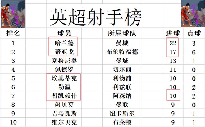 射手榜方面,哈兰德22球领跑,蒂亚戈17球排在第2,塞梅尼奥13球位列第3。佩德罗11球排在第4,哲凯赖什今天梅开二度后,追上埃基蒂克和勒温,三人10球并列第5,前十的门槛也被提高到了9球。