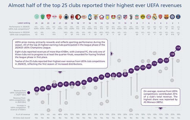 在这25家俱乐部中,有12家在2024-25赛季报告了其在欧足联俱乐部比赛中有史以来最高的收入,这反映了分配增加的首个赛季。